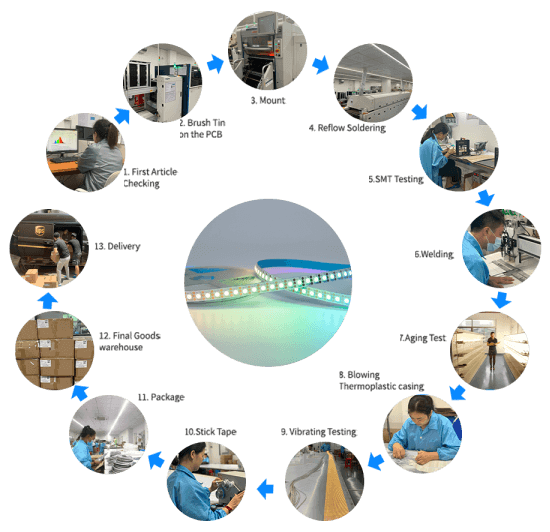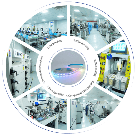 The production process of the strip is standardized, equipped with fully automatic equipment and a dust-free workshop, together with strict aging tests. Extreme environment test (high and low temperature resistance), IP level test, etc.